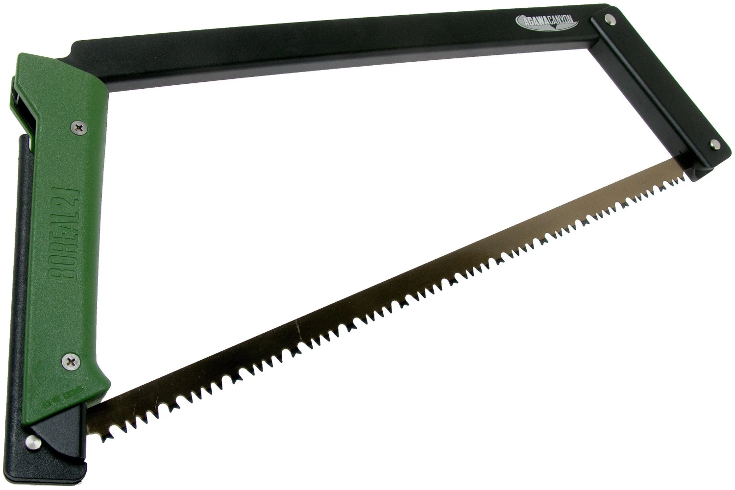 Benutze die Agawa Canyon Boreal21 auf all Deinen Outdoor-Abenteuern. Sei es beim Campen, Backpacken, auf der Jagd oder bei der Gartenarbeit. Um Dich und Deine Ausrüstung zu schützen, befindet sich die Säge im zusammengelegten Zustand vollständig im Frame. Im geschlossenen Zustand ist die Säge nur 54,6 cm lang und 5 cm hoch, sodass Du sie problemlos mitnehmen kannst. Trotzdem hast Du ein Sägeblatt mit einer Länge von 53,3 cm bei Dir. Dank der glasfaserverstärkten Nylonarretierung stellt sich das Sägeblatt automatisch auf die richtige Spannung ein und schneidet so immer perfekt.