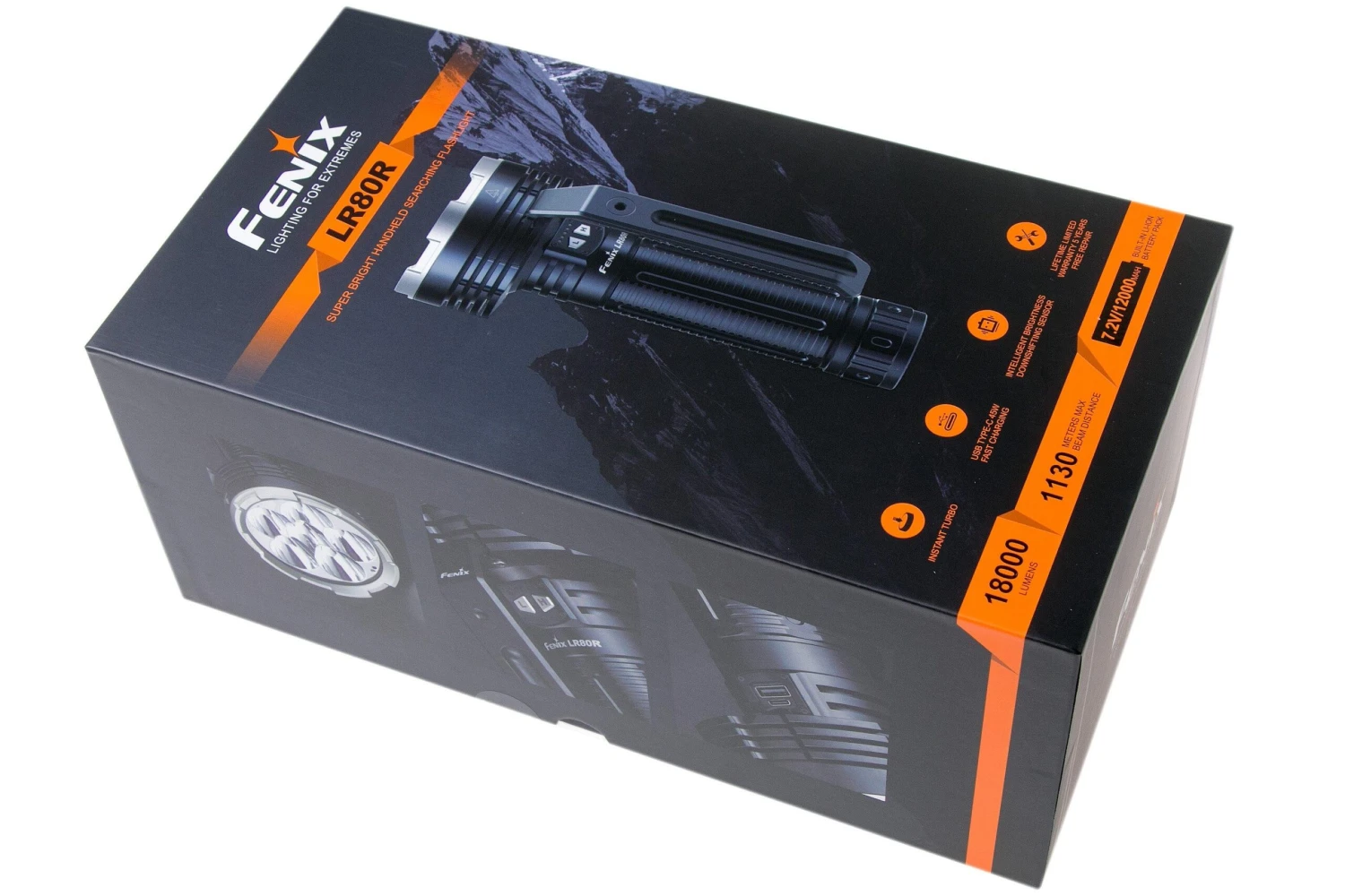 Die Fenix LR80R ist eine sehr starke Taschenlampe mit einem Output von ganzen 18.000 Lumen und einer Reichweite von 1130 m! Die Lampe wird über den 45W USB-C-Eingang geladen. Dieses Kraftpaket ist mit einem intelligenten Sensor ausgestattet, der seine Helligkeit automatisch anpasst, wenn Du ein Objekt, das weniger als 6 cm entfernt ist länger als 1,5 Sekunden beleuchtest.
