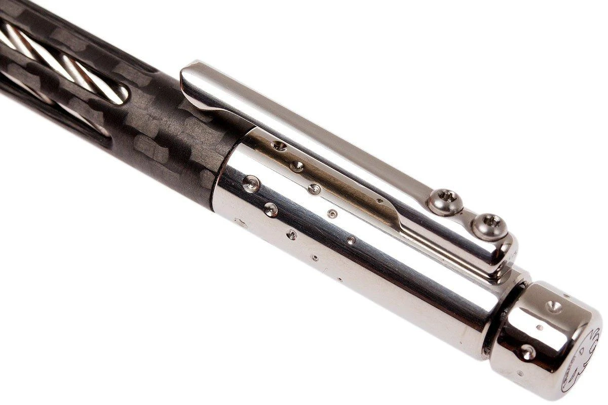 Der LionSteel Nyala ist ein sehr exklusiver Titanstift, der von Tommaso Rumici entworfen wurde. Er wurde aus den besten Materialien und mit den besten Techniken hergestellt. Das ist wirklich ein Stift, der sich sehen lassen kann. Einzigartig ist die Hülse um die Mitte des Stiftes. Diese ist aus Kohlefaser gefertigt. Das gedrehte Profil des Titankerns und die Aussparungen in der Hülle verleihen dem Nyala ein anspruchsvolles Aussehen. Wenn Du die Hülse um den Kern drehst, entsteht ein schöner optischer Effekt.