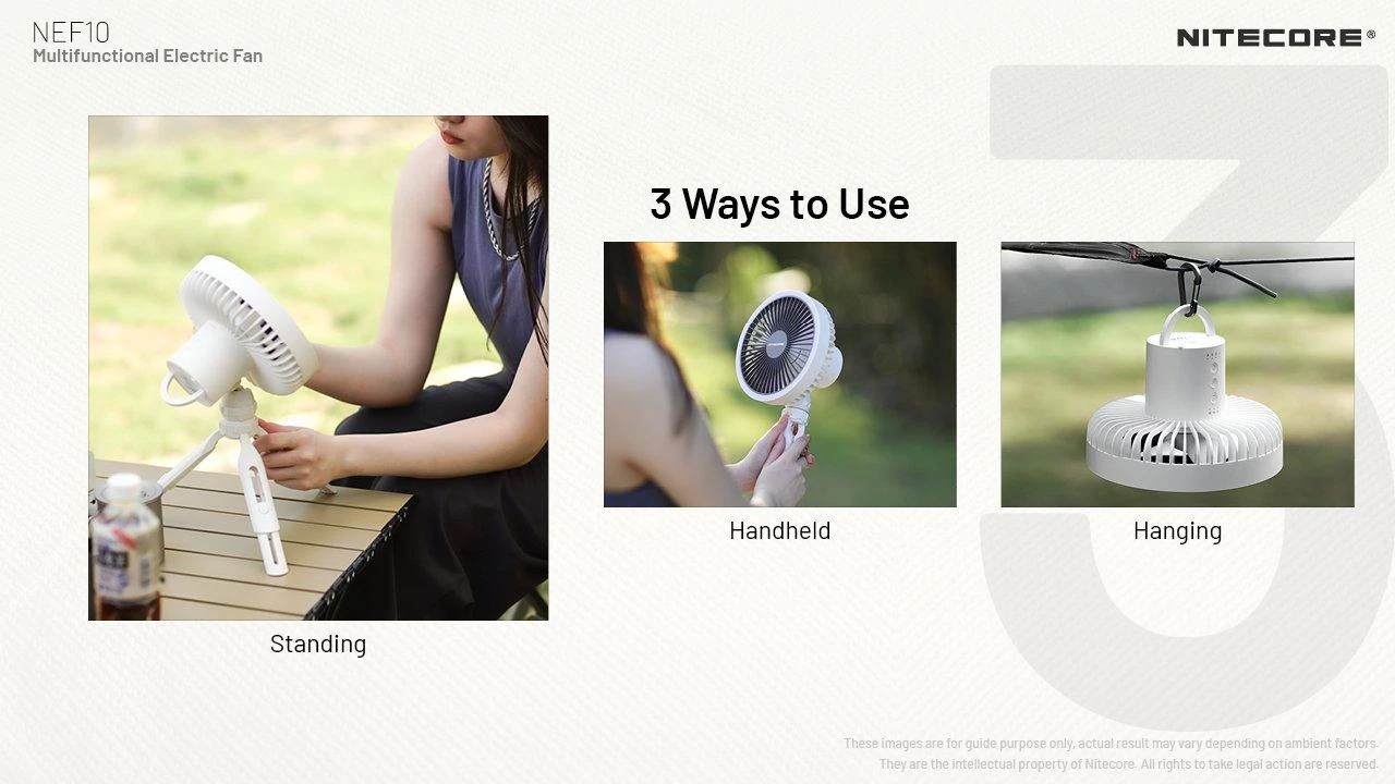 Der Nitecore NEF10 ist Ventilator, Lampe und Powerbank in einem. Der NEF10 hat eine Leistung von 10.000 mAh. Genug also, um Dein Handy mehrmals aufzuladen. Oder um den Ventilator bis zu 27 Stunden laufen zu lassen. Der Ventilator ist übrigens sehr leise; man hört ihn kaum drehen. Der NEF10 kann auf verschiedene Weise verwendet werden: Du kannst ihn auf sein Stativ stellen, in der Hand halten oder aufhängen. Das Stativ hat einen runden Kopf, sodass Du den Ventilator in alle Richtungen verstellen kannst. Und die Füße sind verstellbar. So steht er auch auf unebenem Untergrund immer sicher.