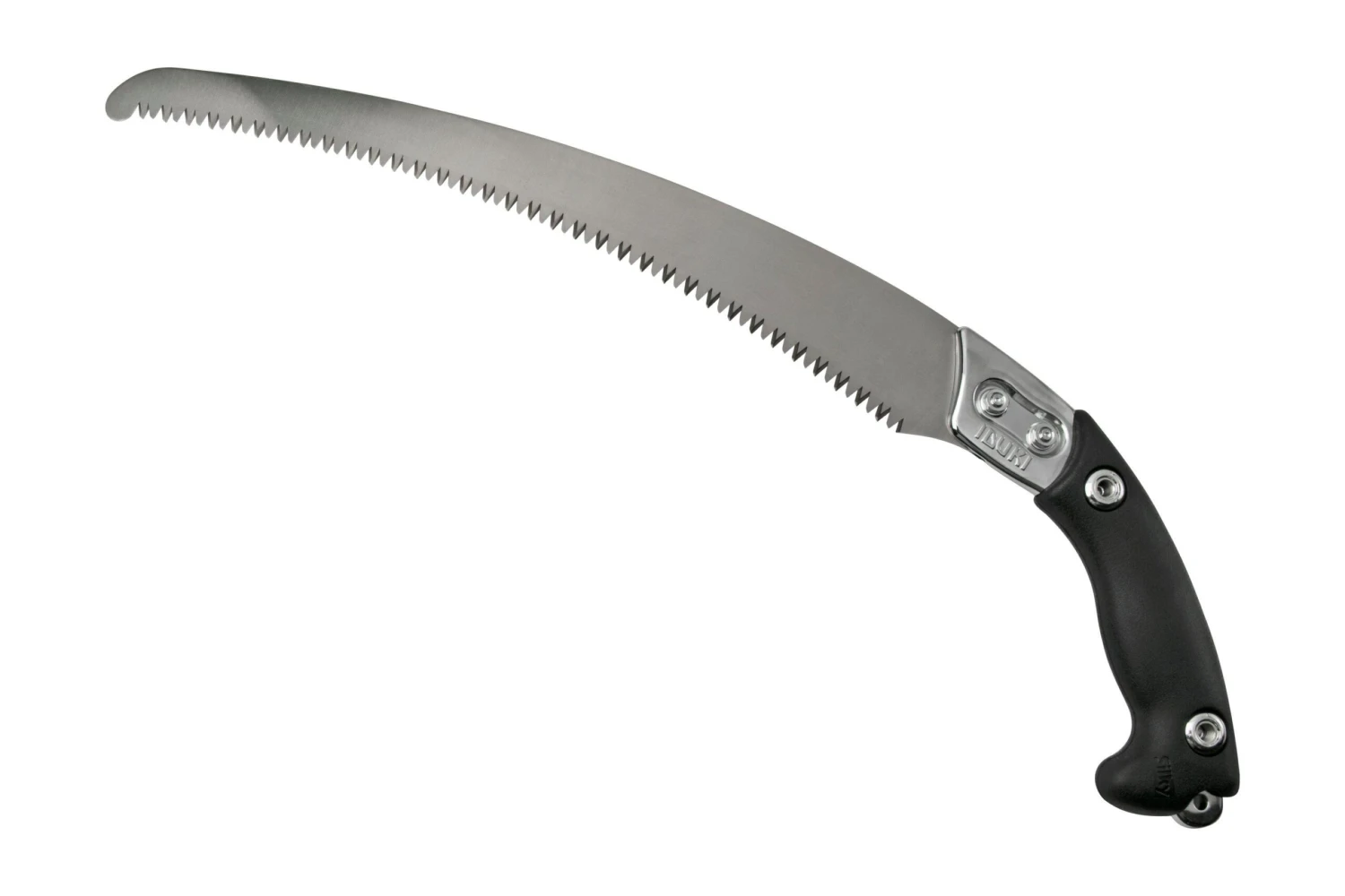 Die Silky Ibuki 390 ist absolut nicht zu übersehen. Das Sägeblatt ist nicht weniger als 39 cm lang und hat einen großen Griff. Das Sägeblatt ist durch zwei Schrauben austauschbar. Diese können mit einem Schraubendreher gelöst werden. Das Sägeblatt ist feststehend, die Säge kann also nicht einfach einklappen.